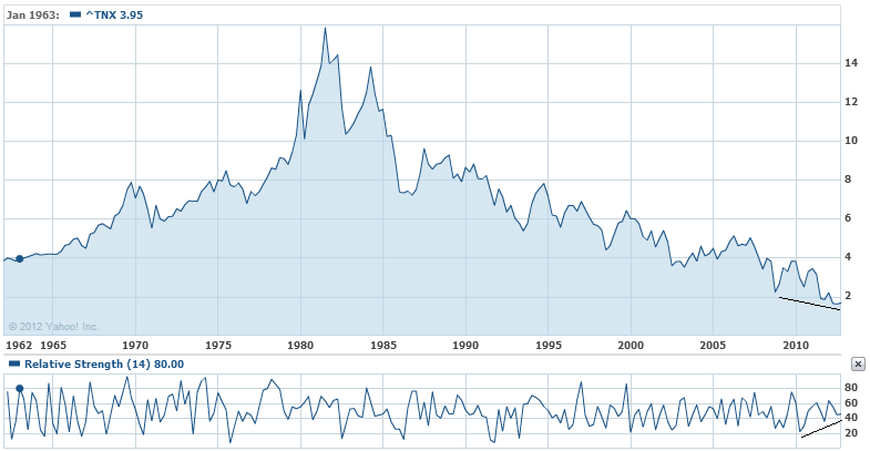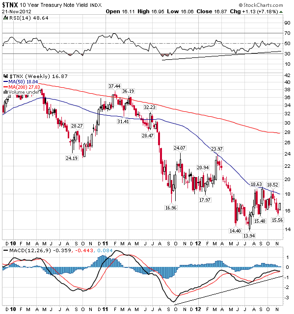 10 year treasury yields are still toying with a potential bottom. A positive RSI divergence on the longer term view: