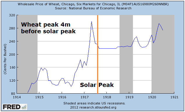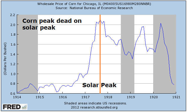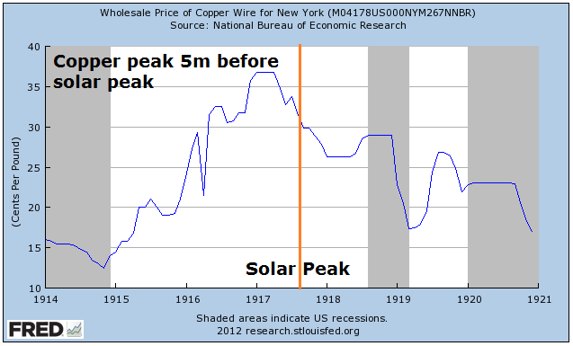 Firstly, 1917. Copper, corn and wheat all peaked between 5 months before and on the actual official solar peak. Whilst silver did not peak until 2 years later, its acceleration began around 12 months before the solar peak.