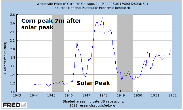 Secondly, 1947. Oats, corn and wheat all peaked around 6 months after the solar peak. Whilst copper did not top out until 15 months after the solar peak, the bulk of its gains occurred in the run up into the solar peak.