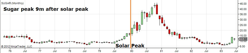 Thirdly, 1980. Copper and gold peaked with the sun, with oil and sugar peaking 4 months and 9 months after the solar peak respectively.