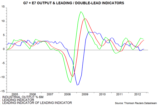 Global narrow money as a leading indicator continues to show growth into the Spring but thereafter it could weaken: