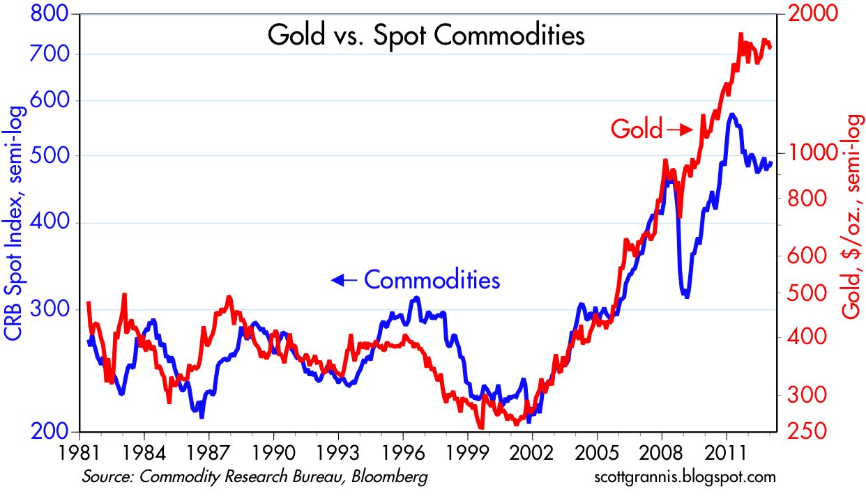 Yet there has been a disconnect in the last 18 months between gold and general commodities, shown here: