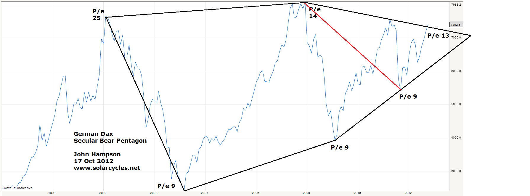 A couple of charts from October last year showing how that could be so. What if the secular bear pentagon for the Dax needs redrawing as per the red line – that the market broke out in 2011 then retested the nose level of the pentagon later that year (in a final cyclical bear at that time), reaching a final single digit p/e valuation of 9?