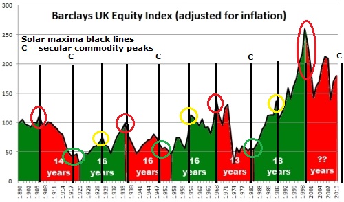 Thirdly, the commodities index long term, with solar maxima marked. Again, alternating secular bulls and bears, and again secular turns falling very close to solar maxima.