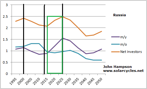 If these projections hold true, then the four lowest listed regions should offer the best opportunities over the next solar cycle. The following solar cycle the USA stands to fare well (where the blue line flattens). And later his century Russia and Eastern Europe may get their shot at being investment gold.