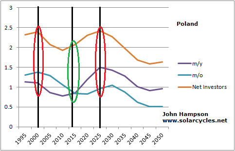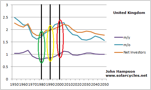 So there we have our three way correlation between sunspots, demographics and equities (and housing too). Because of the solar cycle related births swells, we will find certain demographic groups peaking in numbers and relative numbers around solar peaks. That provides peak demand or supply (e.g. a peak in retirees disinvesting), and together with the sun-driven biological changes in human excitement at the peaks, we have a recipe for asset invesment and speculation peaks at solar maxima.