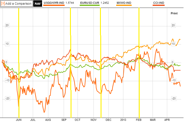 Collectively, these suggest the solar peak is more likely ahead in Fall 2013 than behind us in February 2012. I previously showed that world bond yield and money velocity charts could be bottoming out based on technical action thus far in 2012-2013, and in which case an escalation from here through the solar peak (assuming Fall 2013) would fit well with history. That would also suggest an inflation peak, and a secular commodities peak, lies ahead.