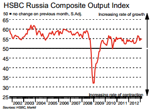 This is evidence that they do not move lock-step, and another glance at the RTS and Crude Oil longer term price correlation chart reveals that there are occasional periods where one can outperform the other. After all, both the Russian economy and the Russian stock index are not just about energy. So with that in mind, let’s take a look at leading indicators for the Russian economy as they stand currently: