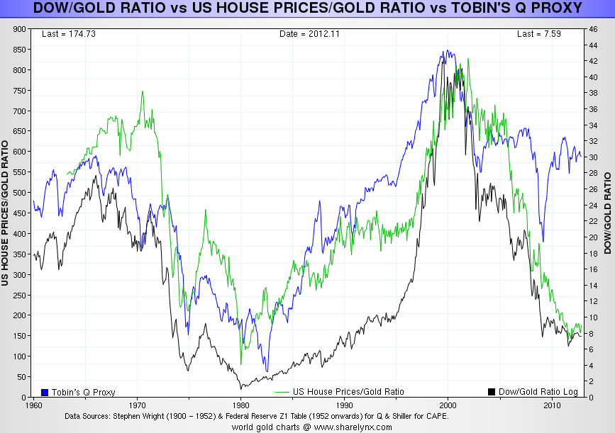This next chart shows how we are into the region of a secular transition in stocks and real estate versus gold. Gold is relatively expensive versus both and a rounded bottoming in the ratios could be in progress: