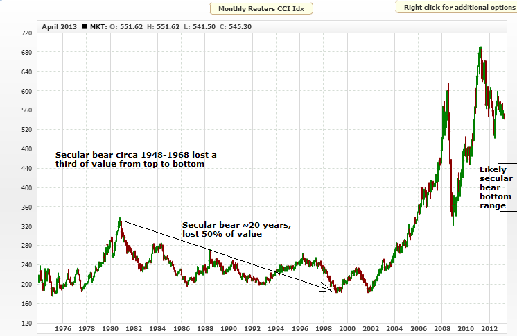 The last secular bear in commodities, circa 1980-2000, lost 50% in nominal value from top to bottom. The previous secular bear, circa 1948-1968 lost a third of its value top to bottom. Assume a secular bear in commodities began following the peak in 2011, then drawing on those past events we could estimate a secular bear bottom in the zone shown: