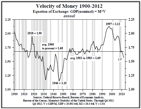 Yes the Fed is manipulating this market, but it is not the difference since 2011 – it was doing this before. Rather it is the mired perception of unsustainable growth. However, since mid-2012 we have seen a sustained positive picture in leading indicators that still persists at the time of writing. Unless leading indicators turn down again sharply soon, then I give good odds to a belated change in perception, a belief in growth, that should generate an upturn in yields, velocity and inflation.