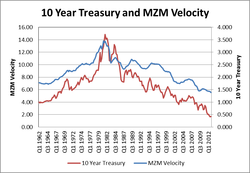 As per my last post on money velocity, there is a historical relationship between the two. Here we see it clearly: