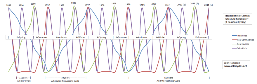 What 1946/7 and 2012/13 do have in common is the solar maximum. If you subscribe to the theory that sunspots drive human excitement and this manifests itself as speculation, buying and inflation, then we have another angle. This alone should encourage money velocity, bullish policy actions, and drive money into pro-risk.