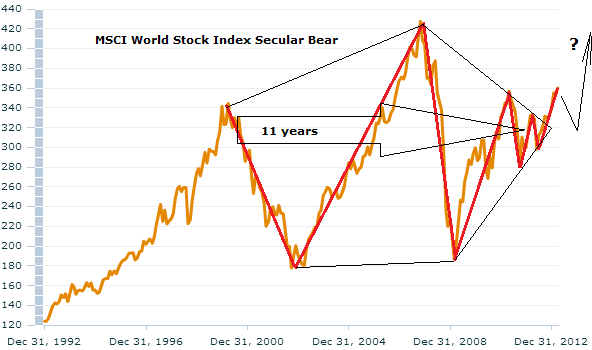 19apr20132In addition to the pentagon formation, I have highlighted on these charts and the top MSCI world chart above what is in effect a large W formation followed by a small W formation (in red). OK, we are operating on a fairly meagre sampling from history here, due to many country stock indices only having recent history, so perhaps don’t read too much into either of the formations that I am picking out. However, the message from both the pentagon and the WW formation would be that secular bears typically end with a coiling, a narrowing of volatility, and based on that we might not expect another major cyclical bear market ahead.