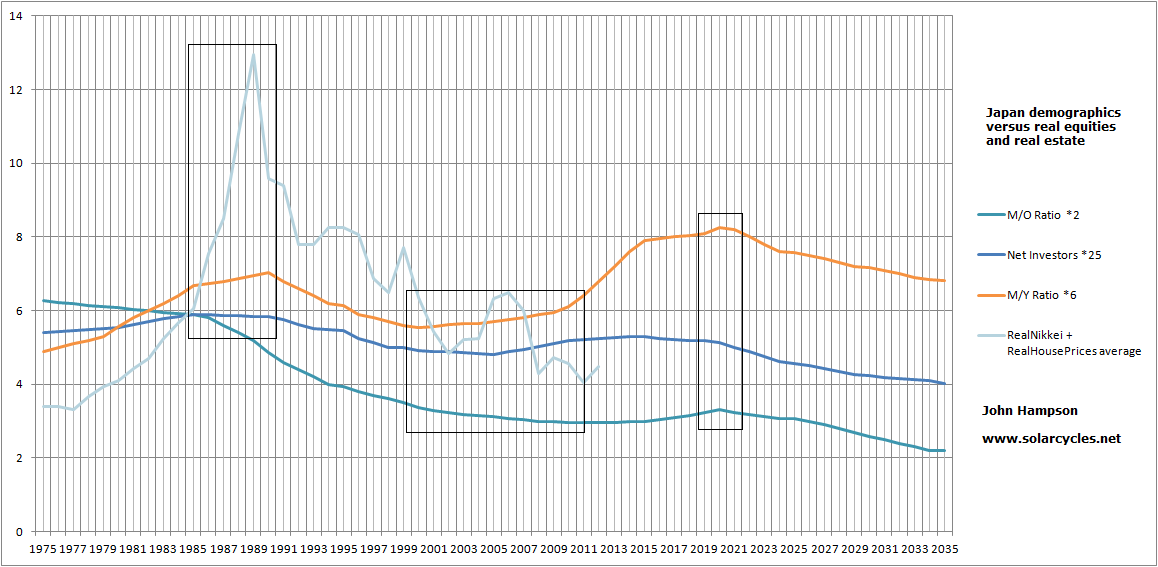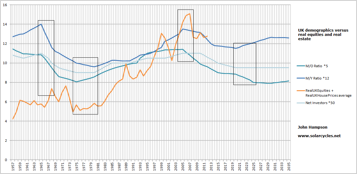 The first chart shows US demographics, using middle-old, middle-young and net investor ratios, modelled against a composite of real stock prices and real house prices. The composite topped along with demographics circa 1965, then bottomed together around 1980, then topped again around 2000.