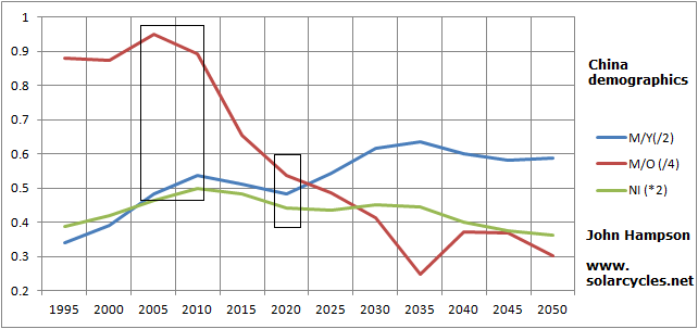 China made an excess-greed peak in equities and real estate circa 2007, tying in with the topping of demographic trends. It now faces difficulties until circa 2020.