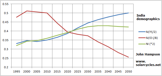 India is in an ongoing uptrend in two measures, and the middle-old ratio is a little deceptive as India is starting from a very small older population which is growing. For that reason there is a downtrend in the ratio, but it is still fairly benign compared to the more developed countries above.