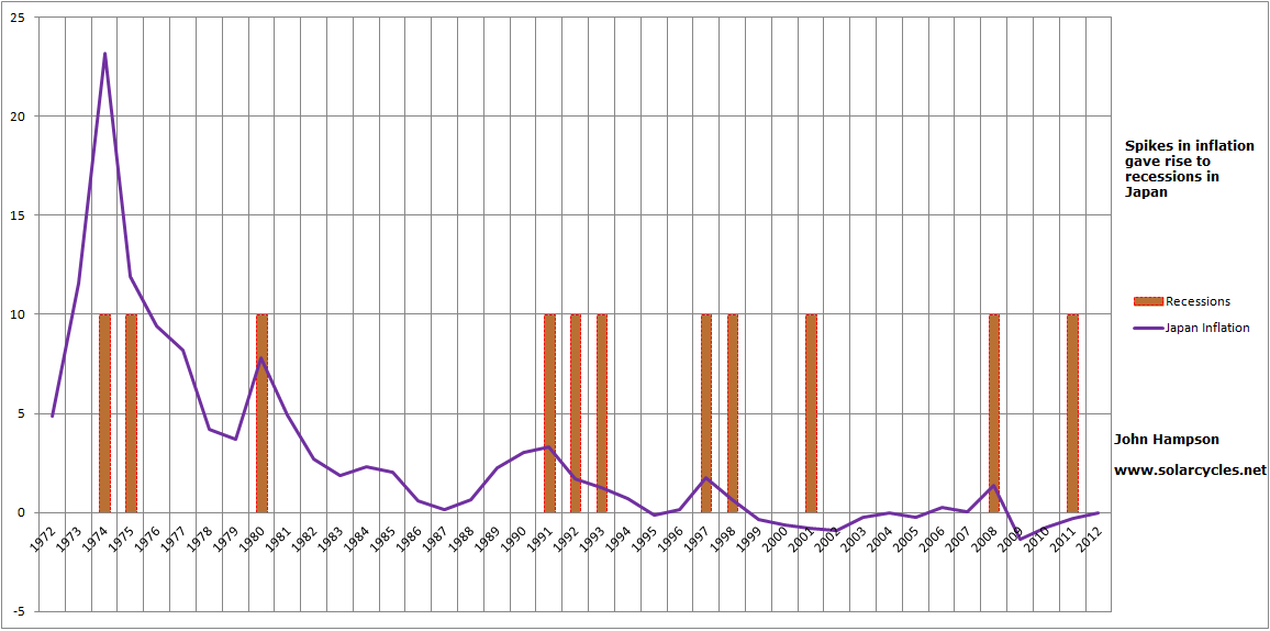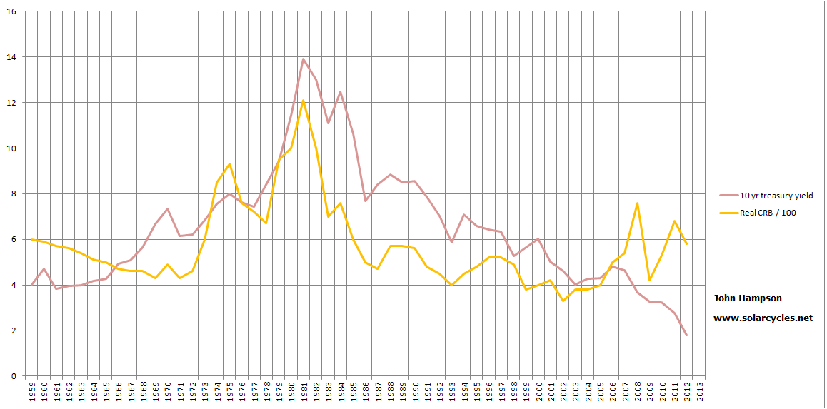 We know the performance in equities largely correlates with demographic trends, and from research in my recent posts, we know that there is a solar cycle influence on demographics. However, is that ‘every third’ solar cycle rhythm just an accident, or is it a ‘natural’ sine wave? The long term real Nikkei chart reveals links with solar peaks but no such repeating rhythm. However, commodities have made a secular bull once again over the last decade, in alignment with the pattern.