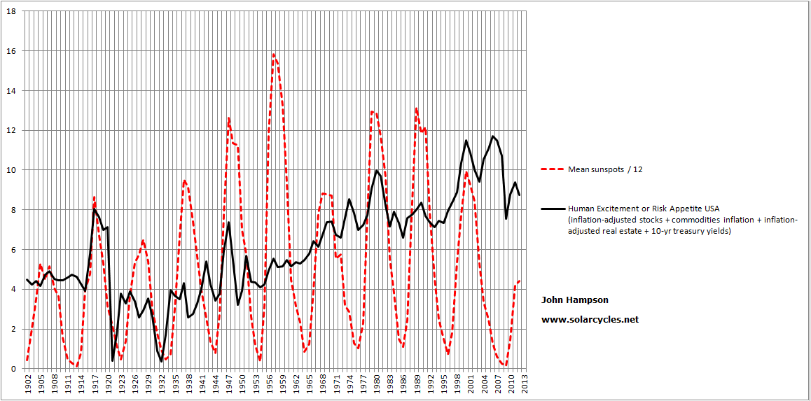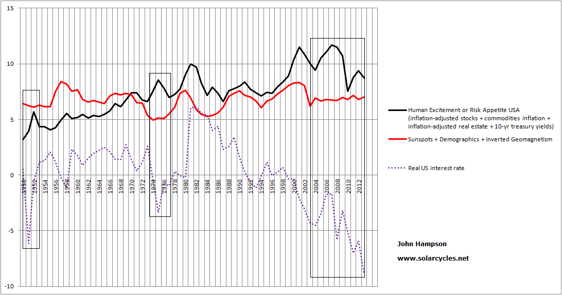 With all that in mind, this is my view on what is most likely to happen. Commodities ought to make one last bull rally, in keeping with solar cycle history: excitement and inflation into and around the peak. Both equities and commodities have a history of making major peaks near to the solar maximums, regardless of cyclical patterns. That should tip the world into a recession and equities into a bear, to take off again from yet lower relative value levels circa 2015 once demographics are bottoming out more in the US. For stocks and real estate to be already in secular bull trends at this point – say, from 2011 – is rather counter the collective demographics. This fundamental downward pressure on stocks and real estate (in certain key countries) ought to reassert itself shortly and money flows ought to move into commodities (for likely one last time) under conditions of negative real interest rates.