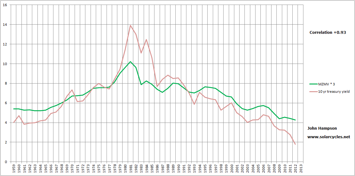 The period into 1917 was similar to 1980: high yields rates and velocity, high commodities and inflation. 1947 similar to today: low yields rates and velocity, high commodities and inflation. Right now we have only mild inflation, but there have been bursts of problematic inflation, particularly in 2008 and 2011. This chart shows those sets of relationships in the US, and the UK experienced very similar.