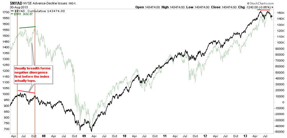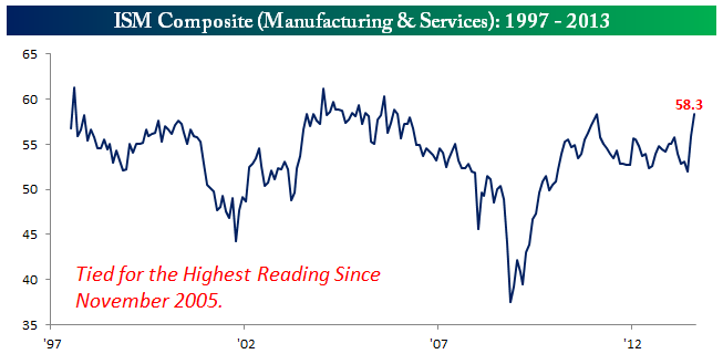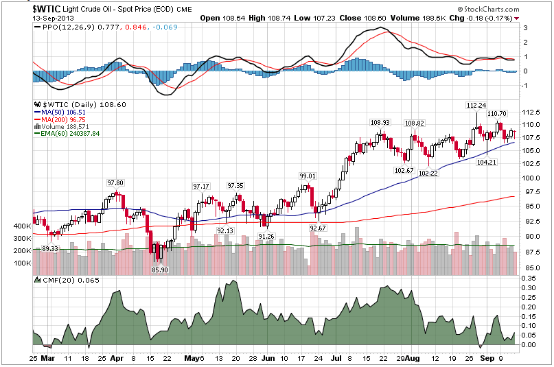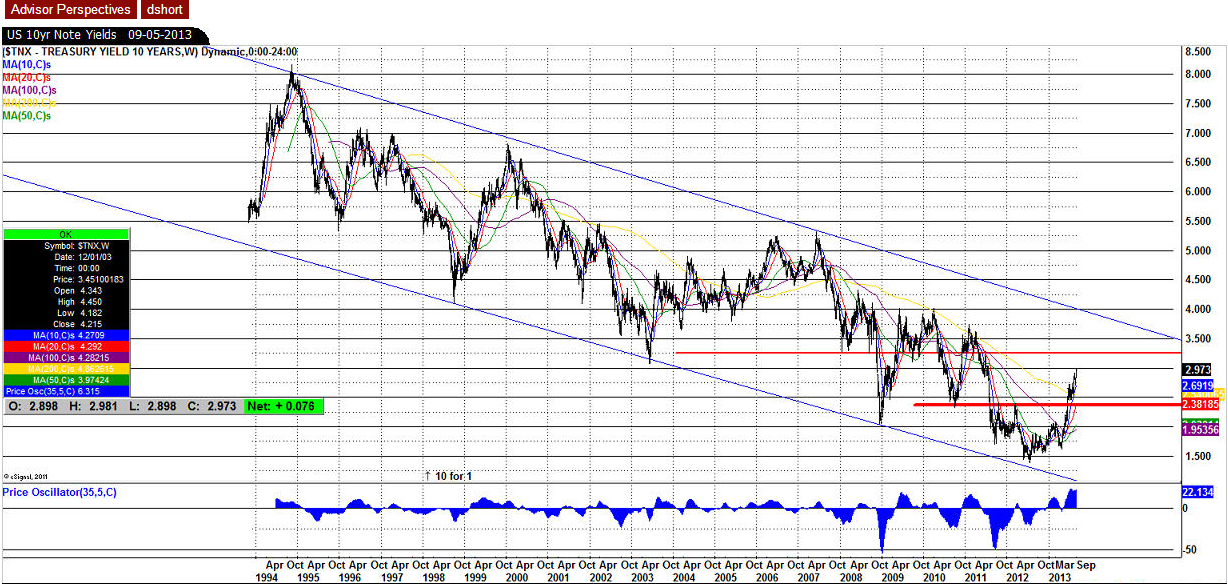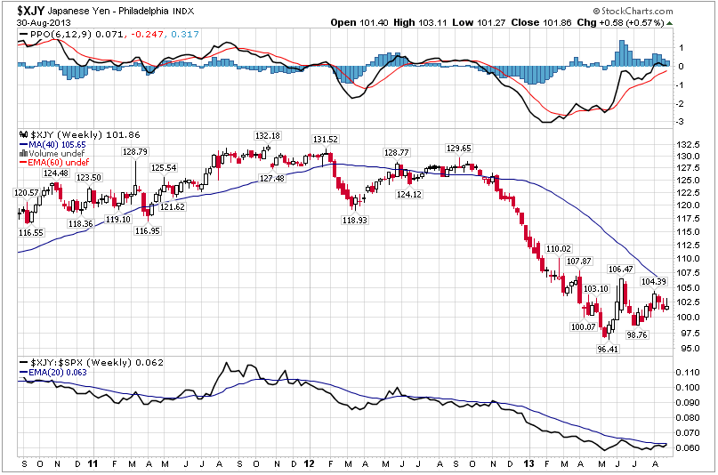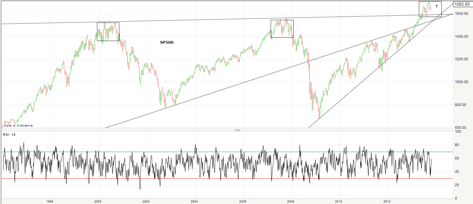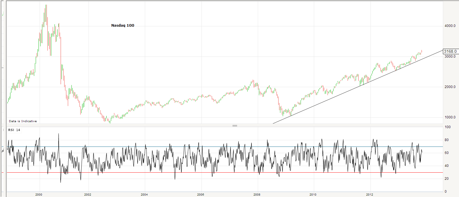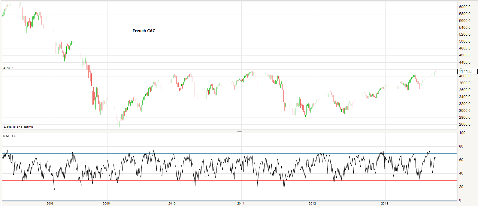 Weak but sustained growth and low rates are typically a good environment for equities, which would be a framework for equities to move higher and reveal the consolidation since May as digestion in an ongoing cyclical bull. In supportive of this, the Nasdaq is now convincingly at new highs for this cyclical bull, and the Dax is back testing its high-to-date (which is also the all-time nominal high). If other indices break up and away from the ‘topping range’ then we would be looking to 2014 for a cyclical top as a multi-month topping process would have to start over. As noted in a recent post we have some evidence for a topping process in play since May, but also some normal signs missing. This should be resolved one way or the other soon.