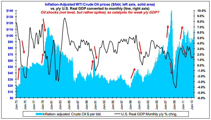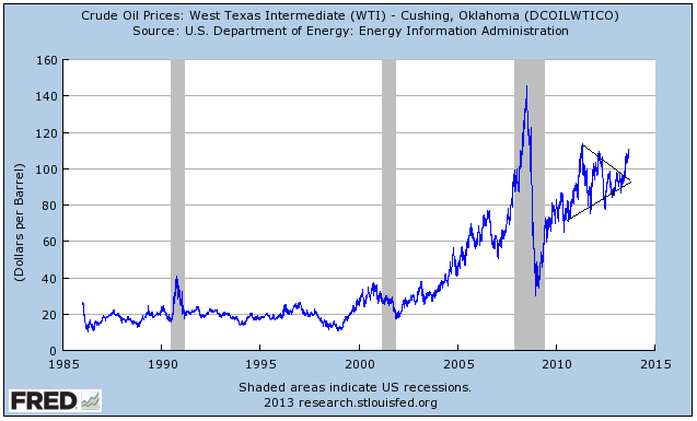 Regarding commodities, the most important is oil, as quick major escalations in oil prices have historically correlated with tipping the economy into recession, due to its importance as an input in so many processes. Despite the slack and weakness in the global economy, crude prices have hung around the $100 level the last 3 years. A speculative move into this asset, for any number of reasons, could under current easy money conditions swiftly lead to $125 oil, which I believe would really test a demographically-challenged weak global economy.