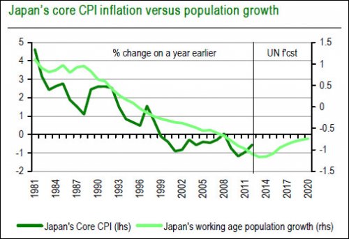 Note that both should be feasible by demographics alone, without ‘Abenomics’. The demographic trends for Japan mean that we should see underlying growth, price stabilisation, and rising asset markets, which I believe will be touted as positive results of Abenomics when in fact largely written by the demographic change of trend.