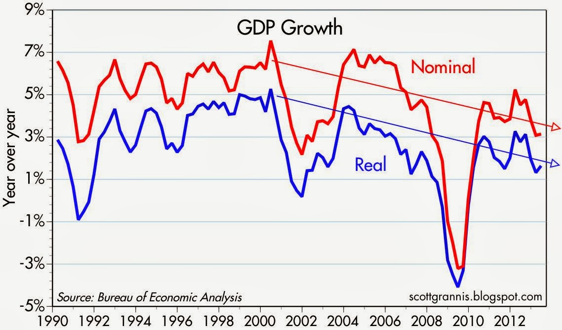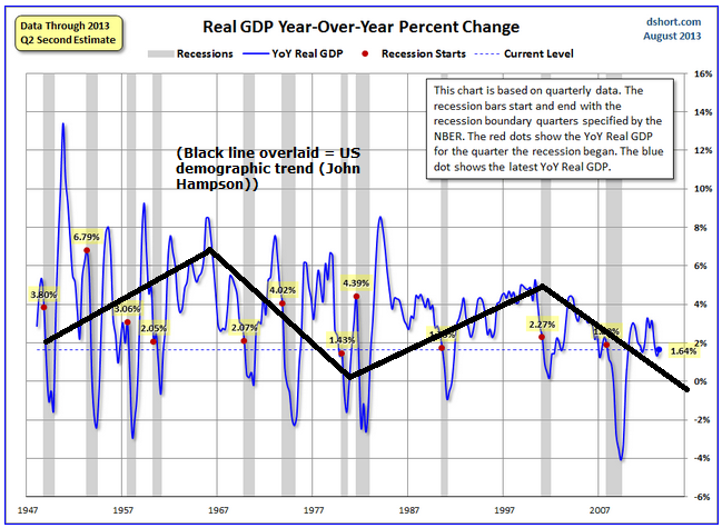 I have overlaid the overall US demographic trend against Doug Short’s real US GDP growth chart here: