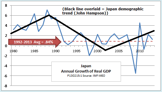 Here is the same for Japan: real GDP growth versus overall demographic trend.
