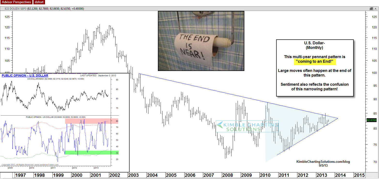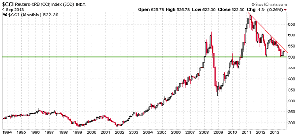 I believe evidence in support of or against this could become clearer as soon as next week, watching the markets’ reactions to the FOMC output. Some mild tapering is being widely touted as a done deal, but the size and the wording we don’t know. Regardless, I expect a big reaction in the markets and it will be telling how commodities, precious metals and the US dollar, fare afterwards. If commodities are going to make a final big rally then the tentative uptrend of the last couple of months should cement and a US dollar breakdown out of its long term triangle (see HERE) would be a great partner for such a development.