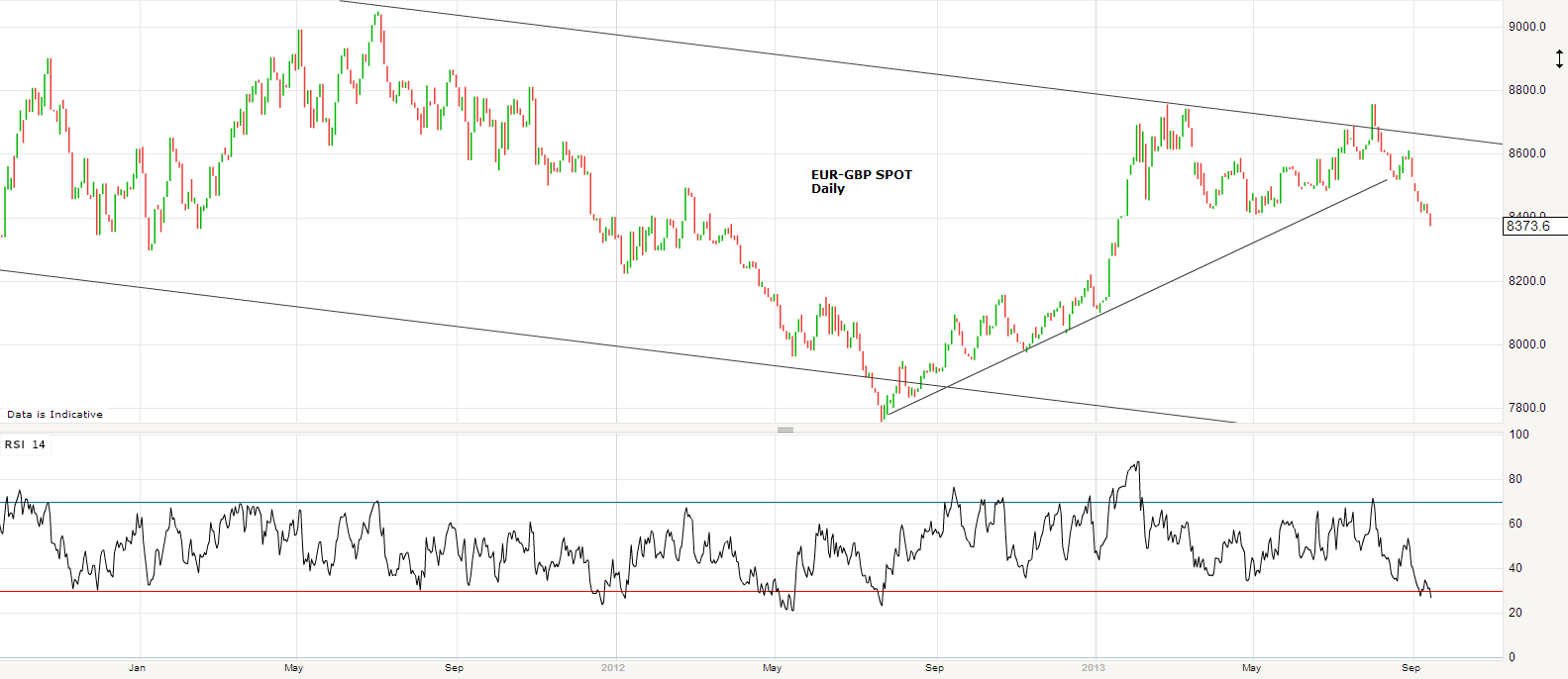 EURGBP has been in a large declining channel since the start of 2009, with the last 3 year snippet shown below. In July of this year the Euro tried to break out, as the Eurozone recovery became more apparent, but it turned out to be a fake-out, and recently UK economic data has surprised to the upside, which has helped not only turn it back down into the channel but also break down beneath the rising Euro support shown. The Pound is fairly overbought now versus the Euro and EURGBP spent last week trying to base. However on Friday there was a further breakdown in favour of the Pound, taking the pair beneath 84. The latest UK inflation data is out this coming week which should influence the pair one way or another, however I believe that ultimately the Euro can drop further here against the Pound, given the technical developments and the change in the fundamental backdrop, and I’m going to hold out for 82- at this point and will review.