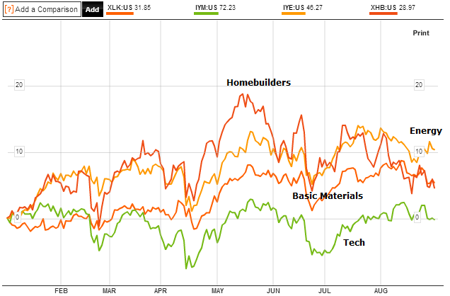 We should also see the batton being passed from early to late cyclicals in the process. As yields rise, interest sensitive groups start to underperform. Below I have compiled two early cyclicals: Homebuilders and Technology sectors, versus two late cyclicals: Energy and Basic Materials sectors: