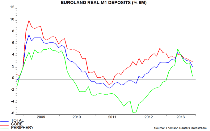 Meanwhile, the Eurozone is perhaps going to pay the price for its cautious central bank policy response since 2008 (compared to US and UK) by entering deflation first. Money supply has not grown in that period and narrow money as a leading indicator suggests the tentative recovery in Europe may be about to fizzle out again.