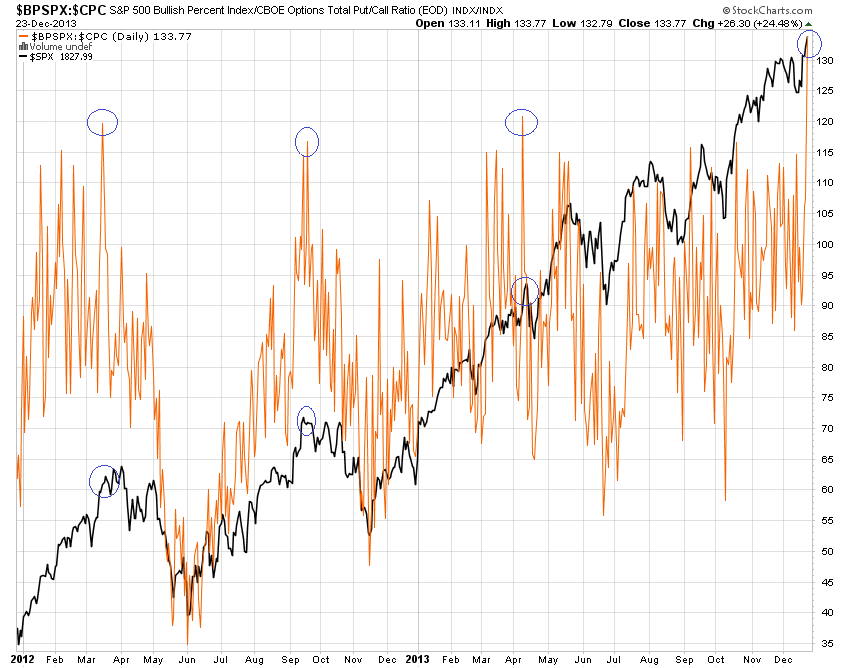 1. Spike in SP500 Bullish Percent over Put/Call Ratio: