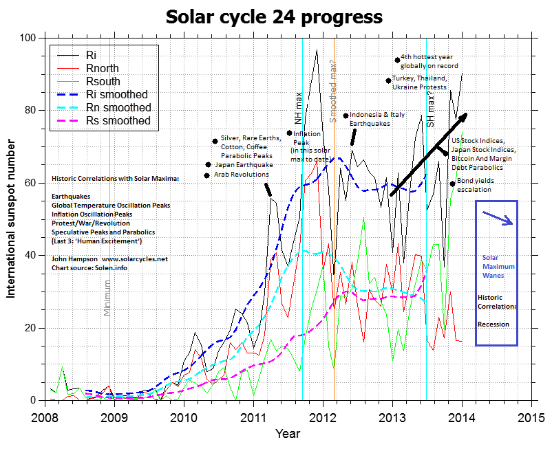 Either way, the annotated top chart is unlikely complete. We could yet see further earthquakes, or greater temperature extremes in 2014, or more geo-political unrest, or more speculative mania. But without any more such developments, solar cycle 24 has re-affirmed those correlations.