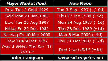 NewMoonMajorPeaksThis adds to the case for a peak having occurred in equities on 31 Dec 2013 (Dow and Nikkei, plus SP500 double top with 15 Jan), associated with the Jan 1st new moon. If that proves to be false and equities break higher, then a future new moon (next one Jan 30th) may produce the timing of the major peak.