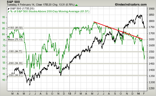 2. Both volume and breadth on the down days in 2014 have exceeded volume and breadth on the up days, which is bearish.