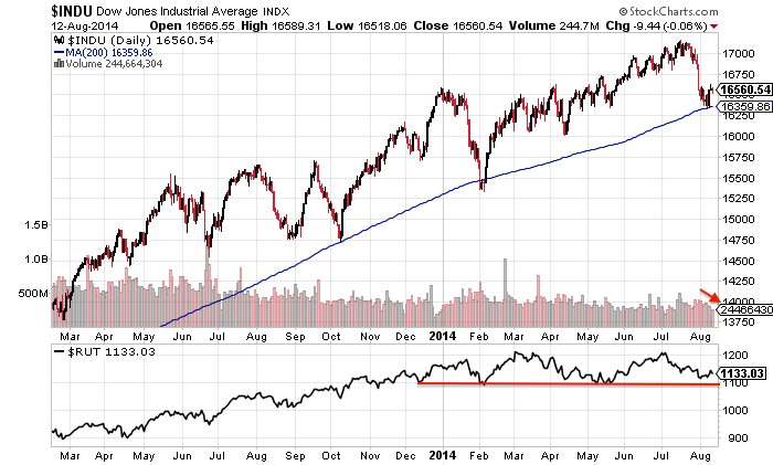 The Dow has been saved 3 times by the 200MA and the R2K 3 times at horizontal support. Looking for a technical trigger for the waterfall declines: both to break down and initiate the voluminous selling. The small red arrow shows that volume has ebbed away the last 3 sessions; volume remains more dominant on down days.