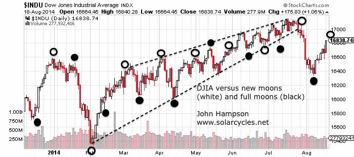 19au26 19au25The Dow versus lunar phase oscillation shows the potential for a peak around the new moon of August 25th, which would also likely be a lower high, adding to the case of the late-July breakdown: