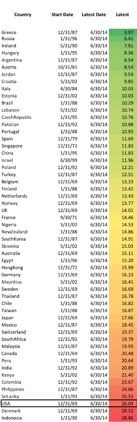 Using the level playing field of the CAPE measure, we can see how the US’s valuation stands up relative to other countries: