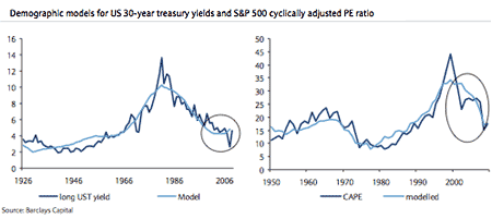 The implication is that market valuation has to be assessed in the context of demographics. An expensive market will get more expensive if there is a swelling population of the age that would buy stocks (or bonds), and vice versa.