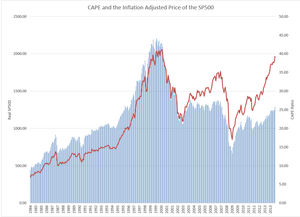 Fourthly, CAPE (or Shiller) valuation. Takes the last 10 years earnings inflation adjusted, and is much more reliable, with a 0.9977 historic correlation with the real SP500: