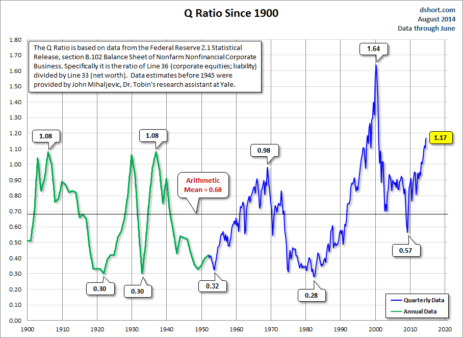 Need to study closer but initial comments. Q Ratio needs to “double” in current climate and the following “Is it the aggression and support of the Fed? If so, then with QE scheduled to end in October, the market should be readying to fall.” Q Ratio needs inflation to adjust for buybacks which should not count anymore in the Q Ratio if you get what I’m trying to articulate. Housing starts, housing prices and loan refi’s will be first to fall in quantity. Will affect commodities and jobs. Drought, you haven’t focused on AT ALL lately John 🙂 is going to get worse. Winter in US due to solar barycenter to be colder each passing year with El Nino muted. On your quote, the Fed financed the buybacks. Rates are locked in ont hsoe debts. Basic accounting principle of issuing stock to raise captial cheaper then if debt is more expensive. The companies owning their own stock, locking in low rates, is not going to “fall”. Only the ability to service the debt via reducing revenue is going to trigger such a free fall.