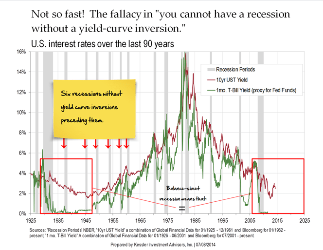 The yield curve as a recession predictor does not work under ZIRP. Japan three times entered recession without yield curve inversion under ZIRP, and the US did likewise in the 1930s-40s.