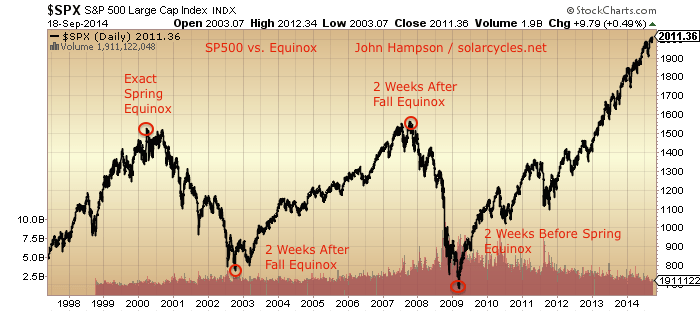 The last 4 major tops and bottoms in the SP500 all fell within 2 weeks of an equinox: