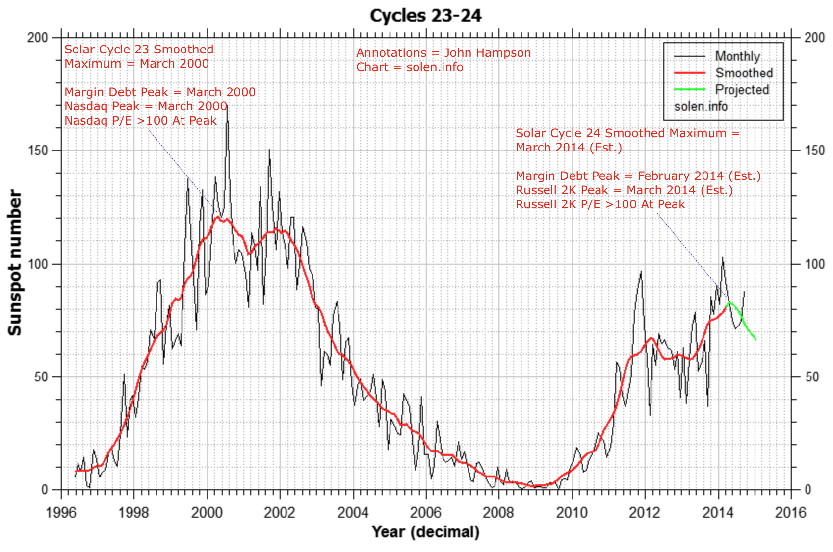 Unlike John, I have a wider window around the solar max where the markets could crash — and I think humans can shift the date for a year or two. I maintain that we could have seen a crash in 2013 if we had tapered back then…