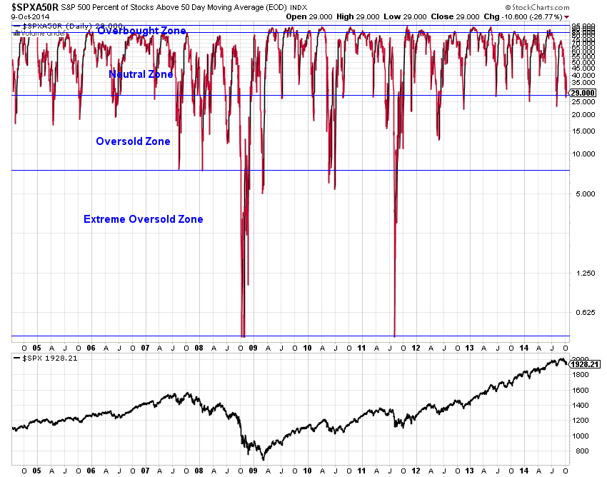 My aim is to try to exit my short trades after the waterfall declines and before that recovery rally erupts. To this end I will be looking to indicators for signs of exhaustion. At the end of Friday, capitulative breadth was still below 10 so the short term does not look washed out, whilst indicators such as stocks above 50MA show we would need to drop some way yet for a true correction: