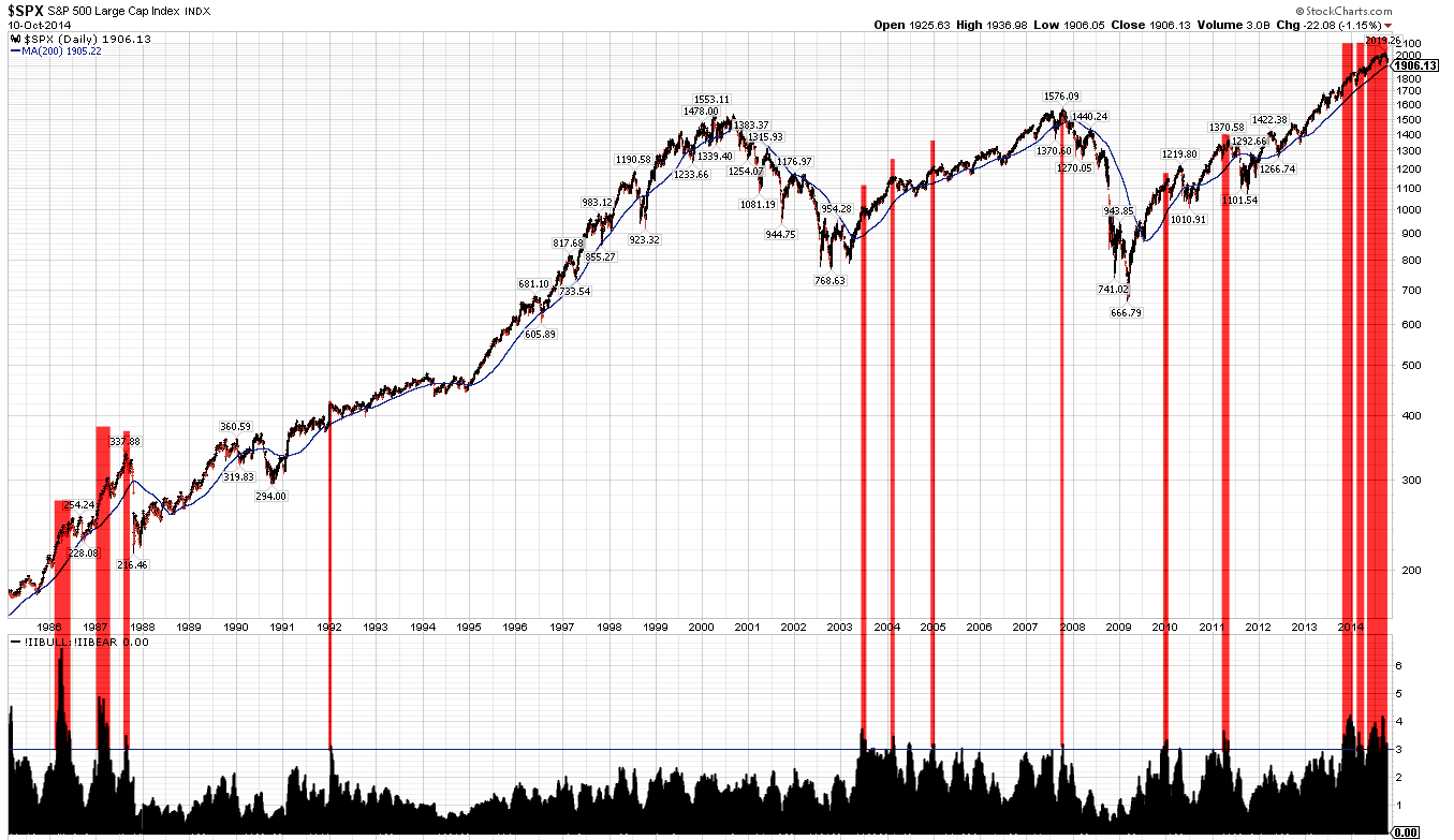 Because we have levitated in a mania for so long, postponing any meaningful correction, I believe the correction has to be nasty when it hits. For example, with this intensity and duration of investors intelligence skewing can we really avoid a repair like 1987?: