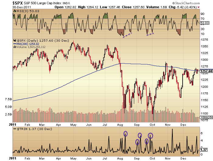 Putting that crash scenario aside, stocks typically need to stabilise and generate positive divergences after a sell-off such as the last few days. They do not v-bounce back up to the highs. For example, below we can contrast the positive RSI divergence in 2011 and the levels of Trin washout compared to now, i.e. both are missing: