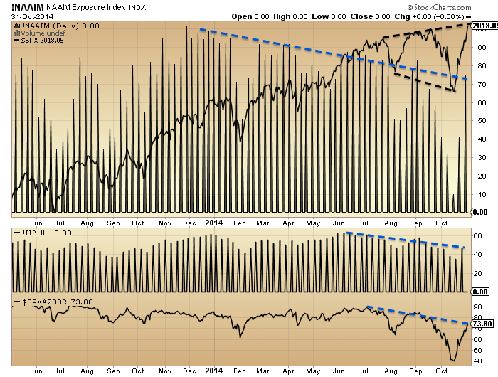 The question mark is over the higher highs in price here in 2014. US large caps have now made yet another higher high in October. However, they do so on negative divergences, similar to 2011 or 2007’s peaking (just marginal highs on clear divergences).